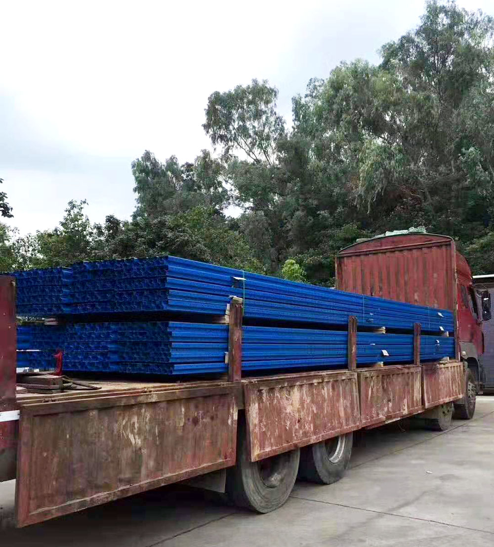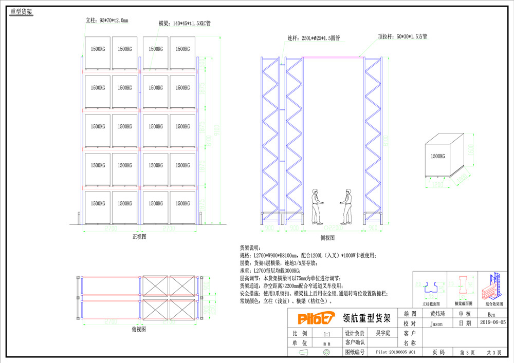 重型貨架由于存儲物品較重,需配合卡板和叉車使用。這次我們設計的高位重型貨架高度是8.1米,四層橫梁五層存放。客戶使用窄通道叉車,我們設計的通道≥2.2米,雙排重型貨架之間用250mm的拉桿連接,并結合客戶使用的是1200(入叉)*1000mm的卡板,重型貨架尺寸設計為: L2700*W900*H8100mm。